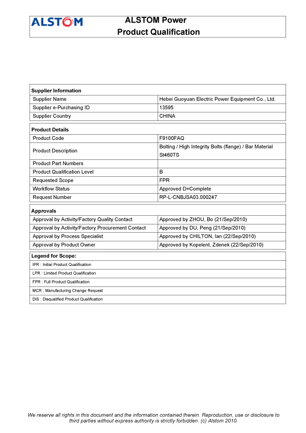 阿爾斯通ALSTOM汽缸螺栓FPR證書
